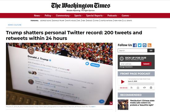 “特朗普打破了个人发推记录:24小时内发推以及转推数达到200条。”《华盛顿时报》6日以此为题记录下了特朗普的这一“记录”。报道注意到,特朗普5日刷新记录,正处于新冠肺炎疫情危机与黑人男子弗洛伊德遭暴力执法死亡引发的抗议活动交织之际。这打破了特朗普之前142条的单日推文记录。