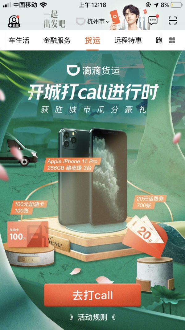 6月8日凌晨,滴滴出行App顶部导航栏默默更新出了“货运”字样,并同步上线了“开城打call进行时”活动,用户可选择城市投票。包括杭州、广州、北京、天津、深圳等10个城市均在列,这也进一步证实了滴滴即将上线货运的消息。