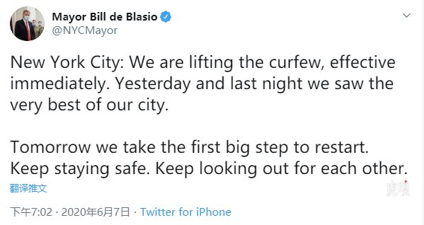 @新浪财经【美国纽约市长宣布提前结束宵禁】当地时间6月7日,纽约市长德布拉西奥宣布解除纽约市的宵禁。德布拉西奥表示,纽约市在执行宵禁后,连续5天未出现大规模混乱。因此,原计划生效持续至6月7日晚的宵禁提前结束。当地时间6日,纽约市多地爆发数万人的抗议游行,游行局面相较本周初时秩序良好。