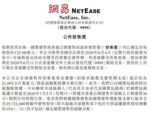 @新浪科技【网易公布全球发售价每股123港元,较美股折价6.67%】2020年6月7日 ,网易宣布,由国际发售和香港公开发售组成、共计新发行171,480,000股普通股的全球发售确定发售价。国际发售与香港公开发售的最终发售价均为每股发售股份123港元。网易最终发售价约合每股美国存托股397美元,与6月5日网易美股收盘价425.37美元相比,折价6.67%。对于这个折价,有经常打新的私募机构人士评价:“折价一般。”
