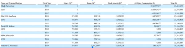 Facebook 2019年高层薪酬,图片来自Facebook年报