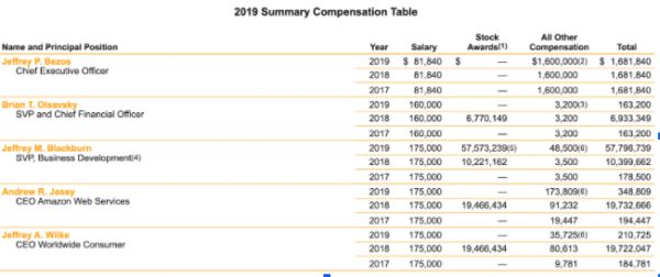 亚马逊 2019年高层薪酬,图片来自亚马逊年报
