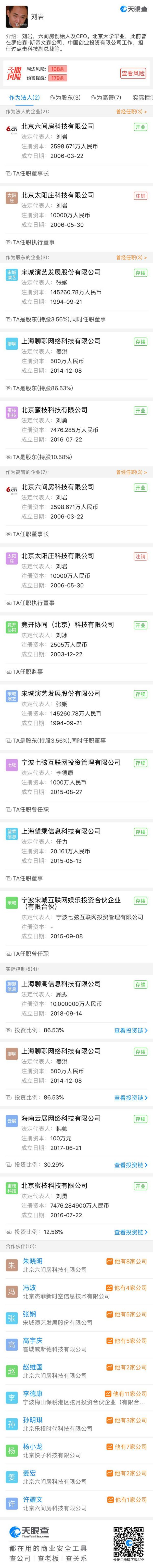 据天眼查上市公告显示,3月28日,宋城演艺发布上市公告称,六间房与密境和风重组后,刘岩将担任首任总经理,其将不再担任宋城演艺副总裁和董事。北京密境和风科技有限公司为花椒直播主体公司,目前奇虎三六零为最大股东,持股45.17%,六间房为第二大股东,持股19.96%。