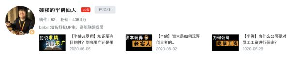 巫师出现之后,大量的自媒体开始涌入 B 站。直到 2020 年初,「硬核的半佛仙人」出现,他在两个月里涨粉 150 万,比巫师财经还要疯狂。