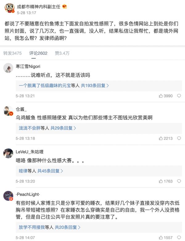 微博博主 @ 成都市精神内科副主任就在一条微博下面提醒粉丝,不要在钓鱼博主下面发性感照片。