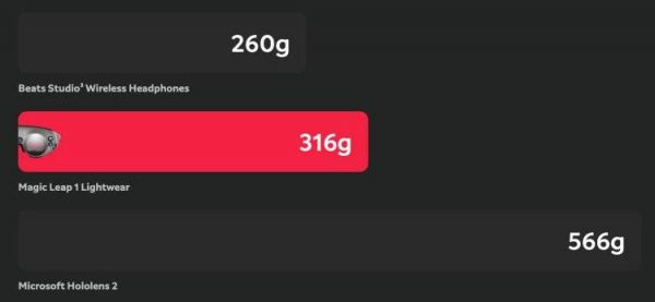 通过这种方法,Magic Leap 把重量降到了 316 克,比 Beats Studio 无线耳机重 56 克,跟普通眼镜重量还是有一定距离。