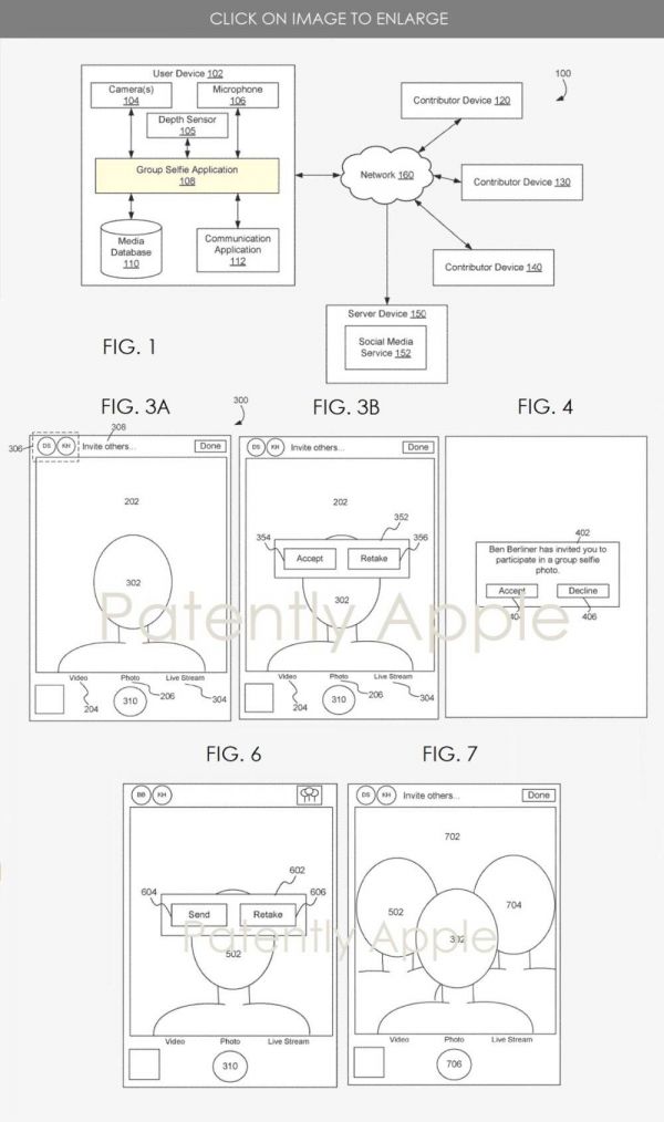 如下专利图 1 所示为生成合成集体照的整体流程图;图 3A 为生成合成集体照的图形用户界面;图 3B(以及图 6)为提供有重新获取图像选项的图形用户界面示例;图 4 为提示贡献者用户(contributor user)加入合成集体照的图形用户界面示例;图 7 为预览合成集体照的图形用户界面示例。