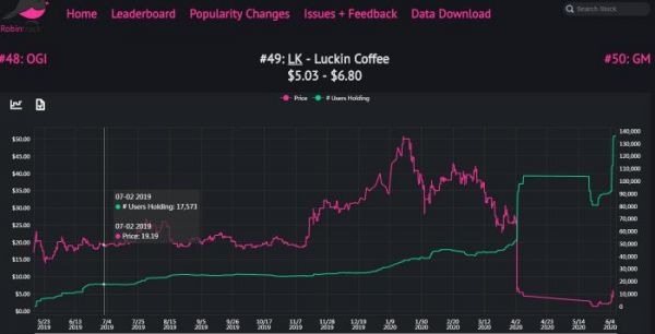 上图是其公布的Robinhood用户持股瑞幸咖啡股票情况,其中,绿色曲线是持股用户数量(右轴),红色曲线是瑞幸咖啡股价(左轴)。可以看到在4月2日瑞幸自曝做假、股价大跌后,持有瑞幸咖啡股票的Robinhood用户数大增,从4月2日之前的5万户左右上升到10万户左右,之后瑞幸被纳斯达克停牌。
