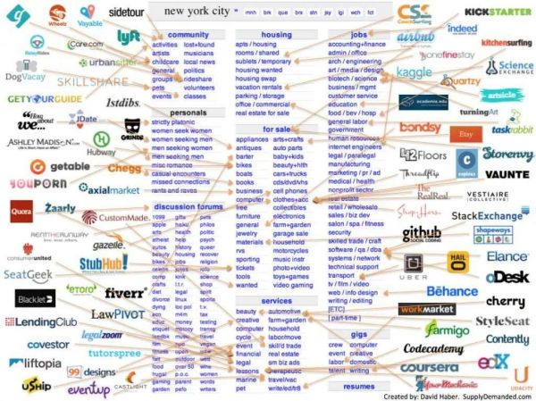 垂直化,这是一种对很多领域都非常有效的策略,早在2010年硅谷有一位叫Andrew Parker的风险投资家基于美国的信息分类网站craiglist来绘制出了垂类细分市场的蓝图。而David Haber在2012年更新了一张图来证实了垂直细分的策略是非常正确有效的。