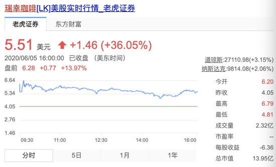 截至6月5日收盘,瑞幸股价为5.51美元/股,较最低点反弹314%,公司市值达到13.95亿美元。