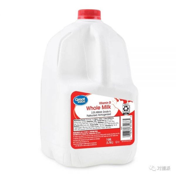 他买的是1加仑装的牛奶,1加仑差不多是3.8升,需要用桶装的。