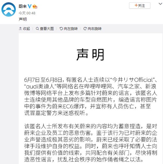 蔚来声明:“蔚来EC6爆炸”为谣言 已采取法律手段维护权益