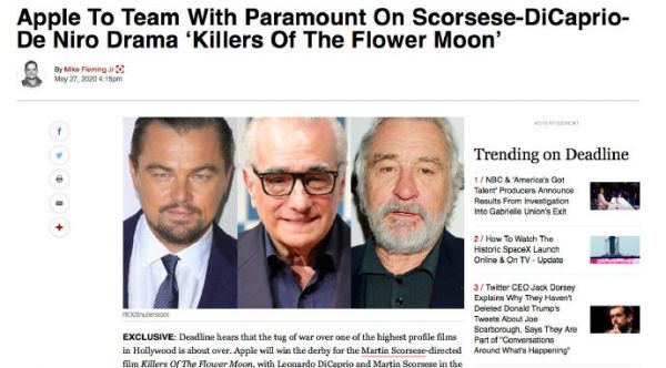 今年4月份传出消息,派拉蒙让斯科塞斯去寻找新东家,斯科塞斯亲自找了Netflix,可Netflix能接受的最高价位是2.15亿美元。Deadline称环球、米高梅等“市面上所有公司”都曾接触过该项目,最终出手的是苹果,且《花月杀手》将会是“Apple原创”,苹果担任该片出品和资方,派拉蒙则负责全球院线发行。