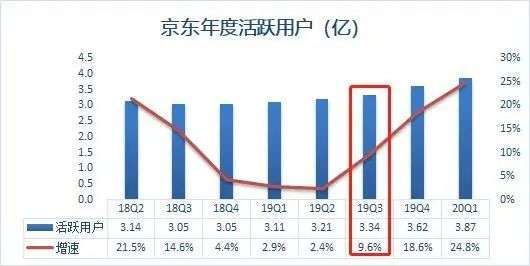 其实2019年二季度京东活跃用户的增速只有2.4%,为历年新低,但从三季度开始,用户增速反弹至9.6%。