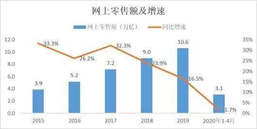 其次,疫情对线上零售造成重大冲击。今年前4个月,网上零售总额的增速只有1.7%。
