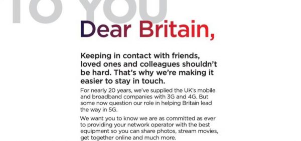 封页广告中写到:“过去 20 年,我们持续向英国的移动和宽带公司提供设备,但如今,质疑我们在英国发展 5G 的声音却越来越多。”
