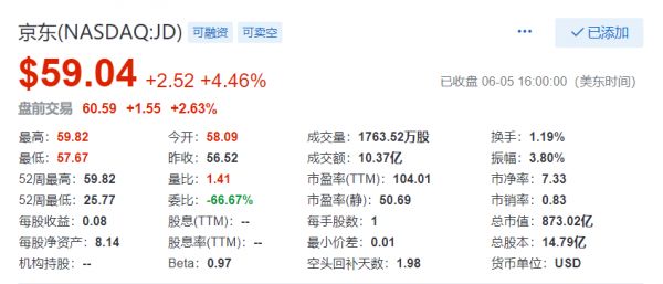 截至目前京东市值为873亿美元,进入到2020年以来,京东股价已上涨67.58%。