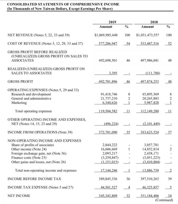 合并营收为新台币 10,699.90 亿元,较 2018 年的新台币 10,314.7 亿元增加 3.7%。净利润为新台币 3452.6 亿元,净收入为 111.8 亿美元,毛利率为 46.0%,而 2018 年为 48.3%。净利润率为 32.3%,比 2018 年的 34.0%下降了 1.7 个百分点。