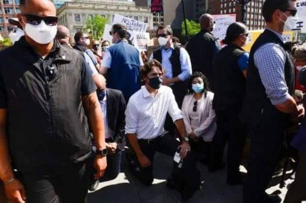 加拿大总理特鲁多现身抗议活动,加入现场数以千计的群众一起单膝跪地,声援美国的反种族歧视与抗议警方执法过当的示威游行。