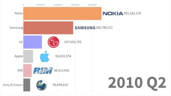 专门做数据分析的油管 Up 主 Data Is Beautiful,曾统计过 1993-2019 年全球智能手机市场的品牌演变。