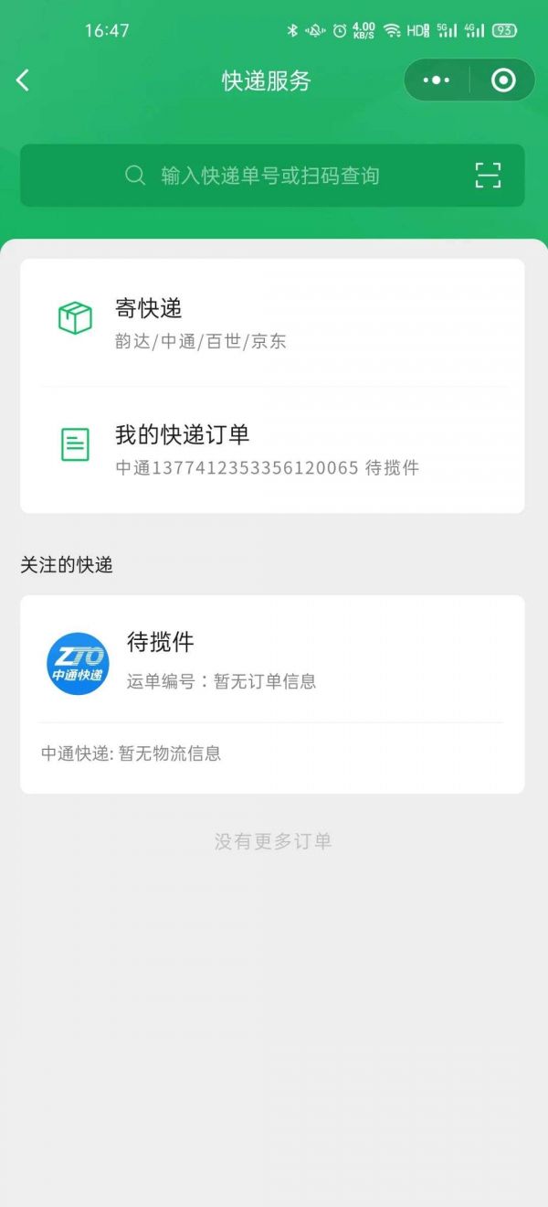 功能区只有两个可点选使用的功能,分别是“寄快递”——一键下快递订单,有韵达、中通、百世和京东可选;另外一个是“我的快递订单”,顾名思义就是查询已经下单和待下单的快递信息,信息量不多但已经足够。