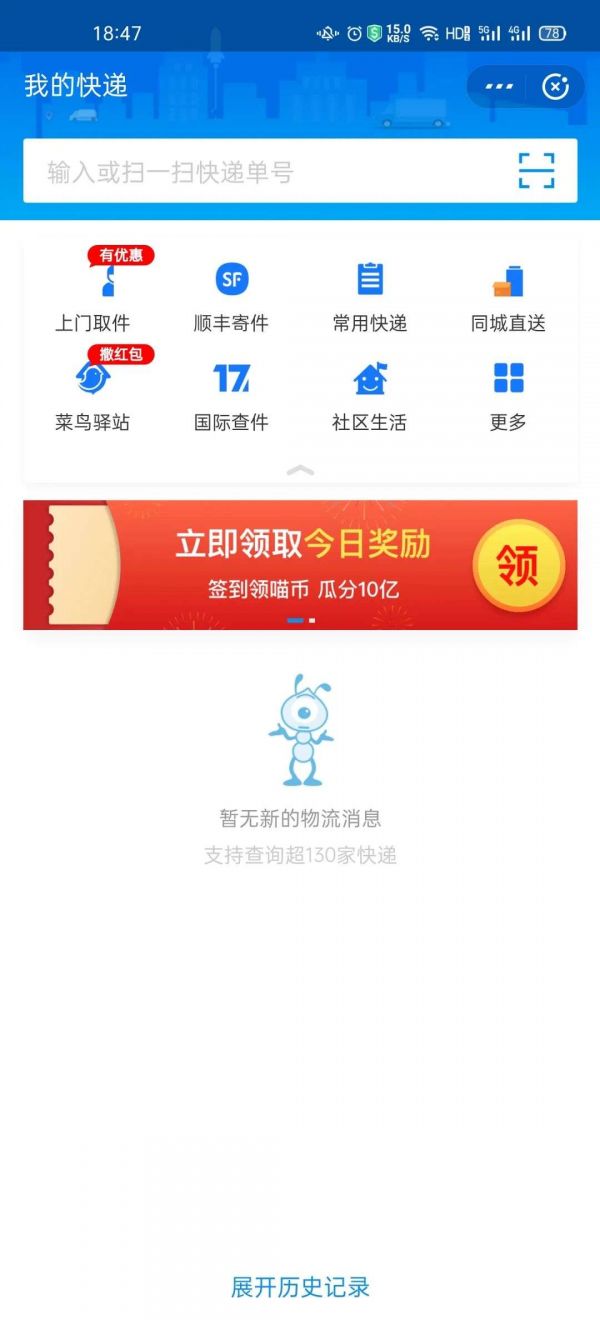 微信寄快递这个小程序的主界面非常简洁,可以分为两大区域,分别是功能区和信息展示区。另外,小程序主页顶部有搜索栏和二维码扫码工具,可以快速地找到订单的信息,系统会自动识别物流公司,还算比较方便。