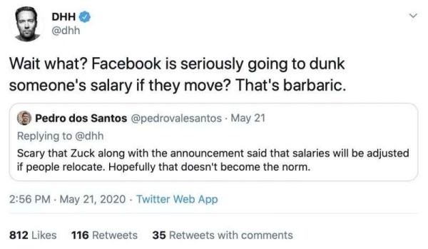 《远程:办公室并非必需品(Remote: Office Not Required)》一书的合著者David Heinemeier Hannson就发推“炮轰”Zuckerberg,称这项工资政策是“野蛮”的。