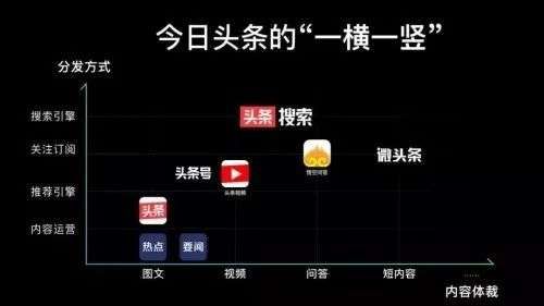 今日头条CEO朱文佳把今日头条的产品逻辑解释为:一横一竖,“一横”是尽可能丰富的内容体裁,“一竖”是尽可能多的分发方式。基于内容体裁和分发方式的丰富,进一步打破了信息茧房壁垒,帮助用户了解更大的世界。