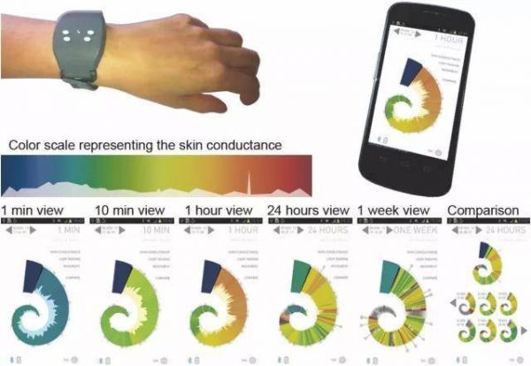 研究人员通过腕式可穿戴传感器设备采集人体皮肤生物学数据,并开发了一个可视化的系统界面,以彩色、变化的图案来描绘佩戴者皮肤电导率和运动信号的实时状态。该系统能够告诉用户,自己的压力水平如何,以帮助用户在运动中达到好的状态,并允许用户跟踪自己的情绪变化。