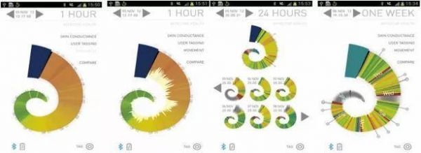 该系统通过可视化界面,以彩色、变化的螺旋形来描绘佩戴者皮肤电导率和运动信号的实时状态,可供用户实时观察,而且可放大时间尺度,回顾历史记录。该系统还能够会告诉用户,自己的压力水平如何,帮助用户在运动中达到好的状态,并允许用户跟踪情绪变化。