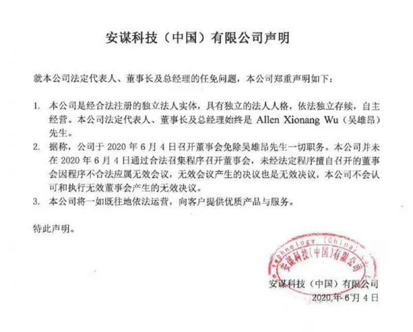 此前安谋中国也曾于6月4日发表声明,称决议无效,不会认可和执行。此前有传闻称,这是吴雄昂在当日将公章抢走后发出的声明。