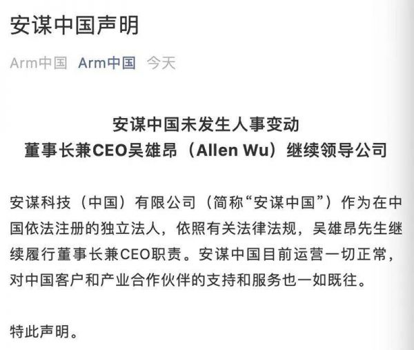 而就吴雄昂任免问题,安谋中国今日发声明称:“安谋中国未发生人事变动,董事长兼CEO吴雄昂(Allen Wu)继续领导公司。安谋中国作为在中国依法注册的独立法人,依照有关法律法规,吴雄昂先生继续履行董事长兼CEO职责。安谋中国目前运营一切正常,对中国客户和产业合作伙伴的支持和服务也一如既往。”