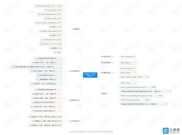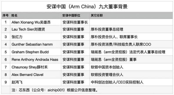 再来看从公开信息中,芯东西查到的安谋中国目前九大董事的背景,除董事长吴雄昂之外,另外8名董事中,有三人是厚朴投资的代表,即Lau Tech Sien(刘德贤)、张红力、Gunther Sebastian hamm,包含董事总经理到消费/科技领域投资Leader等三名;另外有两名是Arm公司全资子公司瑞阁思的两名高管,瑞阁思(上海)商贸有限公司是Arm在中国开展业务的主要实体;还有两位则是软银方面的代表,Chauncey Shey薛村禾是软银中国资本的创始人,Alex Bernard Clavel是软银集团投资管理合伙人,再有一位是中科创达创始人/CEO 赵鸿飞。
