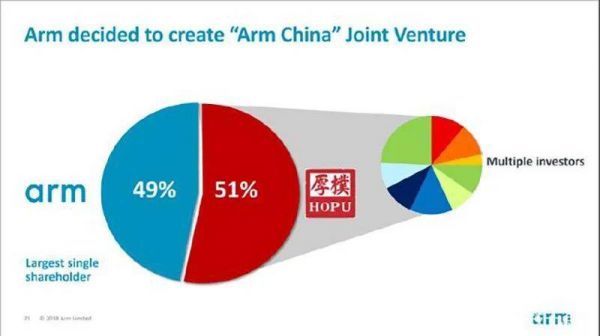 2018年4月,安谋科技(中国)有限公司(简称“安谋中国”)作为中方控股的合资公司正式开始独立运营。当时Arm以约7.752亿美元的价格向将向中国的财务投资者及合作伙伴出售其子公司安谋中国51%的股份。到6月底,Arm的341名员工已经转移到安谋中国的名下。