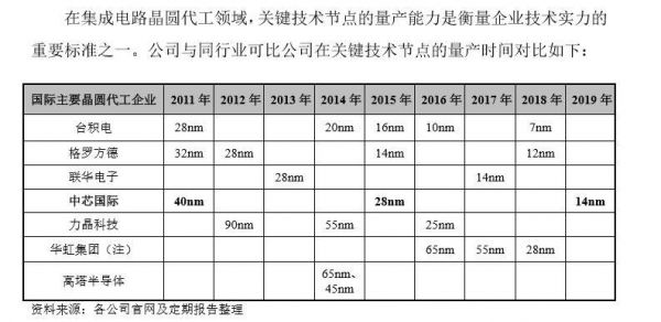 从行业方面看,台积电、格罗方德处于第一梯度,联华电子、中芯国际等处于第二梯队。国内来看,台积电与中芯国际同位于第一梯队。 中芯国际招股书上有一张关于制程量产的对比表格,公司与台积电相比,制程上有四到五年的差距。