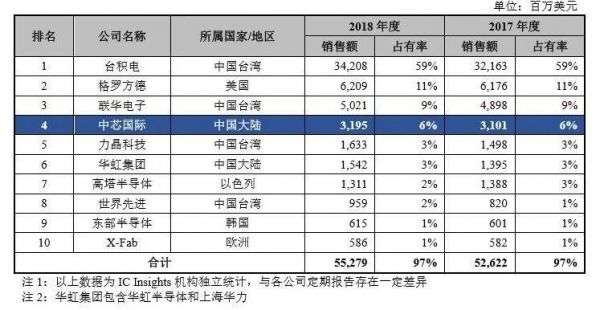 IC Insights 2018 数据显示,中芯国际在纯晶圆代工行业全球市场销售额排名第四,份额占比 6%。台积电、格罗方德、联华电子排名前三。在国内,中芯国际排名第一,市场份额 18%。次于台积电,高于华虹集团。