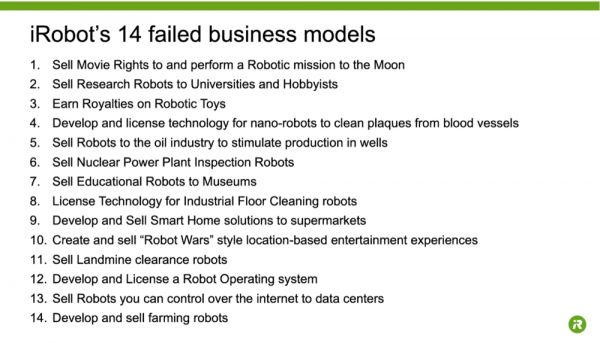 很长一段时间中,这一问题也存在iRobot身上:他们在搞清楚市场需要什么之前,尝试了14种不同的业务模式,有整整8年时间没有挣到钱。