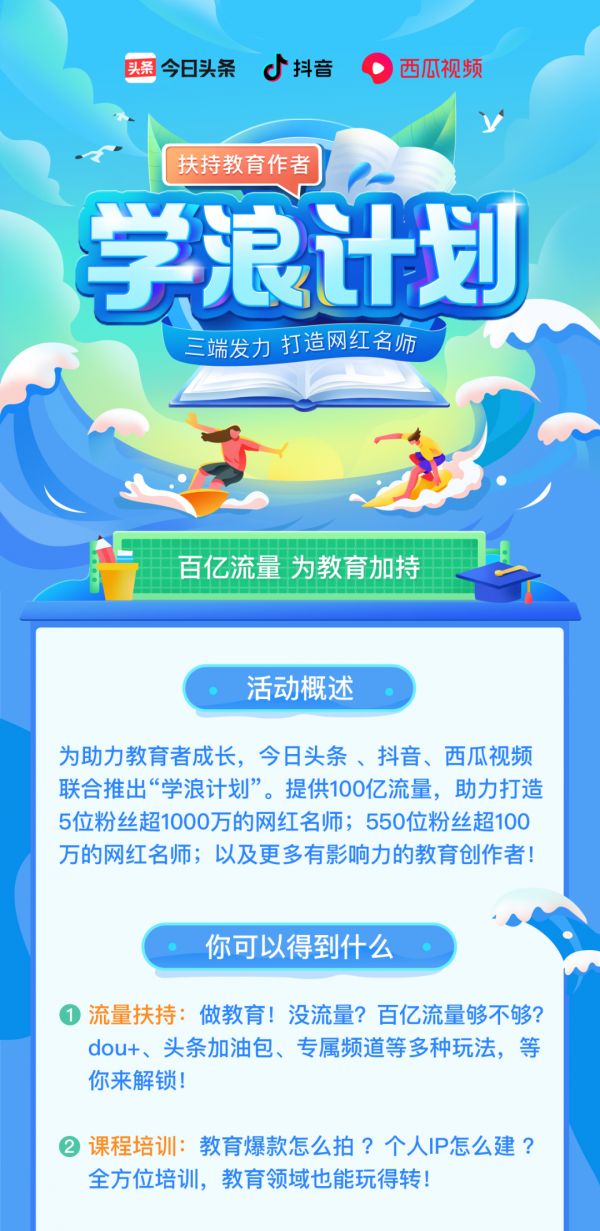 6月8日,抖西头三端联合宣布正式推出“学浪计划”,为包括K12、语言教学、高考、考研、职业教育等领域在内的内容创作者提供超过百亿的流量,力图打造出5位粉丝数超千万、550位粉丝超百万的线上名师。