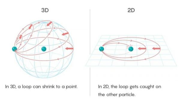 但是,在二维空间中,这个轨迹不能收缩。因为这个轨迹内部包含了另一个粒子。在这个过程中,不切断轨迹就不能继续收缩。因为二维空间的这一限制,一个粒子绕着另一个粒子旋转与将粒子留在同一个位置是不一样的。