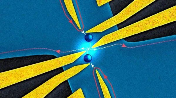 从微型对撞机(如彩色扫描电子显微镜图像所示)获得的任意子存在的证据。任意子沿着由电极(黄色)决定的路径移动。两个任意子(蓝色球体)在中心处碰撞,从两边退出。图片来源:Manohar Kumar