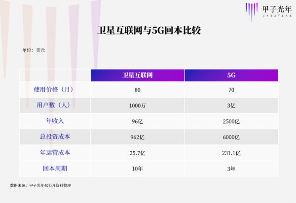 「甲子光年」从通信能力、投入成本、商业回报等方面展,对卫星互联网与5G进行了