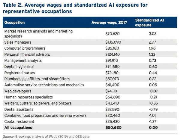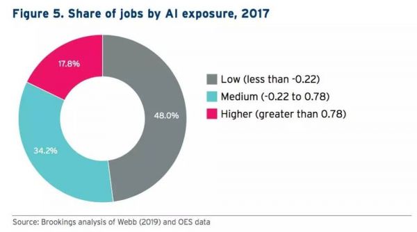 去年年底,布鲁金斯学会(Brookings Institution)利用斯坦福大学一位博士生Michael Webb的新型研究成果,通过量化AI专利和工作描述中重叠的词汇评估了未来AI对于工作的影响。