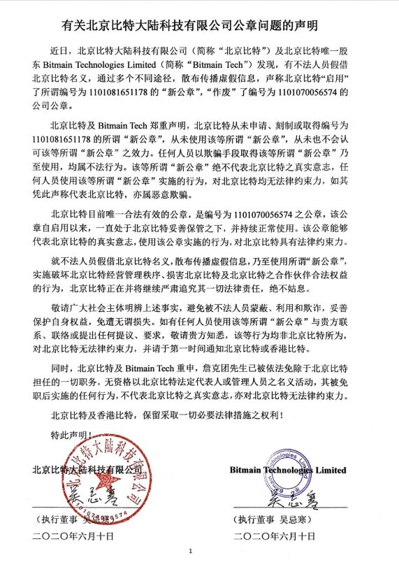 6月11日凌晨,北京比特大陆科技有限公司(简称“北京比特”)联合其唯一股东Bitmain TechnologiesLimited ( 简称“Bitmain Tech”),就公章问题及微信公众号状态异常连发两则声明,对6月10日詹克团发布的《关于启用新公章并作废旧公章的声明》做出回应。