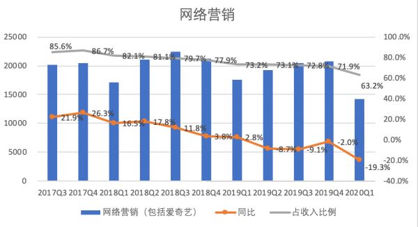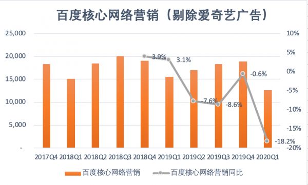 剔除爱奇艺在线广告的影响之后,百度核心网络营销的下降幅度略有减缓。