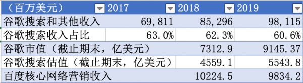 综合这两个因素,将百度核心网络营销收入的估值相对谷歌做等比例对标后,乘以0.3的系数。