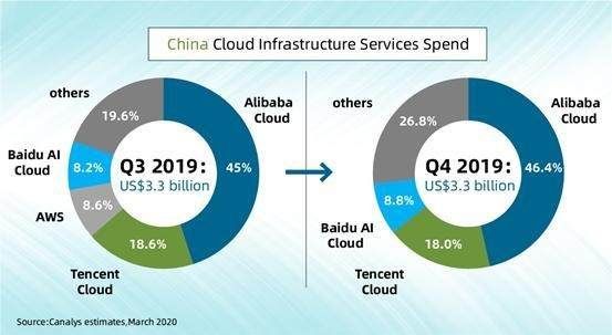 另外根据IDG2020年一季度报告称,百度云2019年Q3、Q4的中国云计算市场的占有率分别为8.2%、8.8%,份额有所提升,仅次于阿里和腾讯。