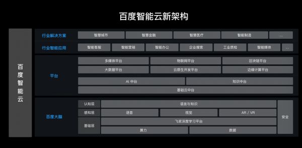 根据上述百度AI体系的调整,智能云包括云计算、人工智能和安全,是中后台与前台的纵向打通。
