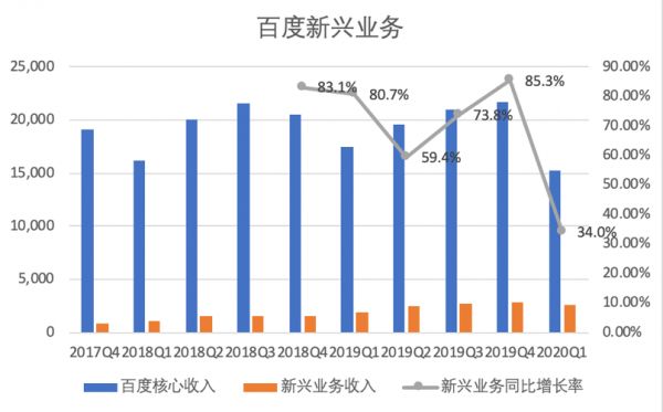 由下图可以看出,百度的新兴业务近两年的季度收入增速最高85.3%,最低59.4%,一季度受疫情影响应该比较特殊为34%,这个增速其实不算慢。