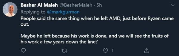 也有人猜测,他可能重回苹果。因为前段时间彭博社报道称,苹果可能会在今年 WWDC 2020 上宣布自家 Mac 产品将会从英特尔处理器转向 ARM 处理器。真是一个巧合的时间点。