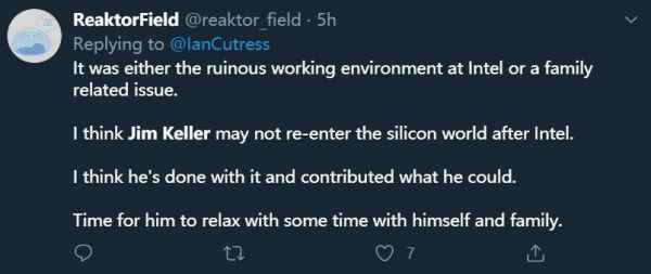 不过,从吉姆 · 凯勒的职业路径来看,他确实是那种喜欢在一家公司工作几年又离开的人。这种方式可以让他寻找不同类型的新鲜挑战。目前来看,英特尔的两年是他最短的任期之一。对此,有人解释说:“他的离开可能是一种功成身退,当年他离开 AMD 也是在 Ryzen 发布之前。也许再等几年,我们就能看到他在英特尔的战果。”